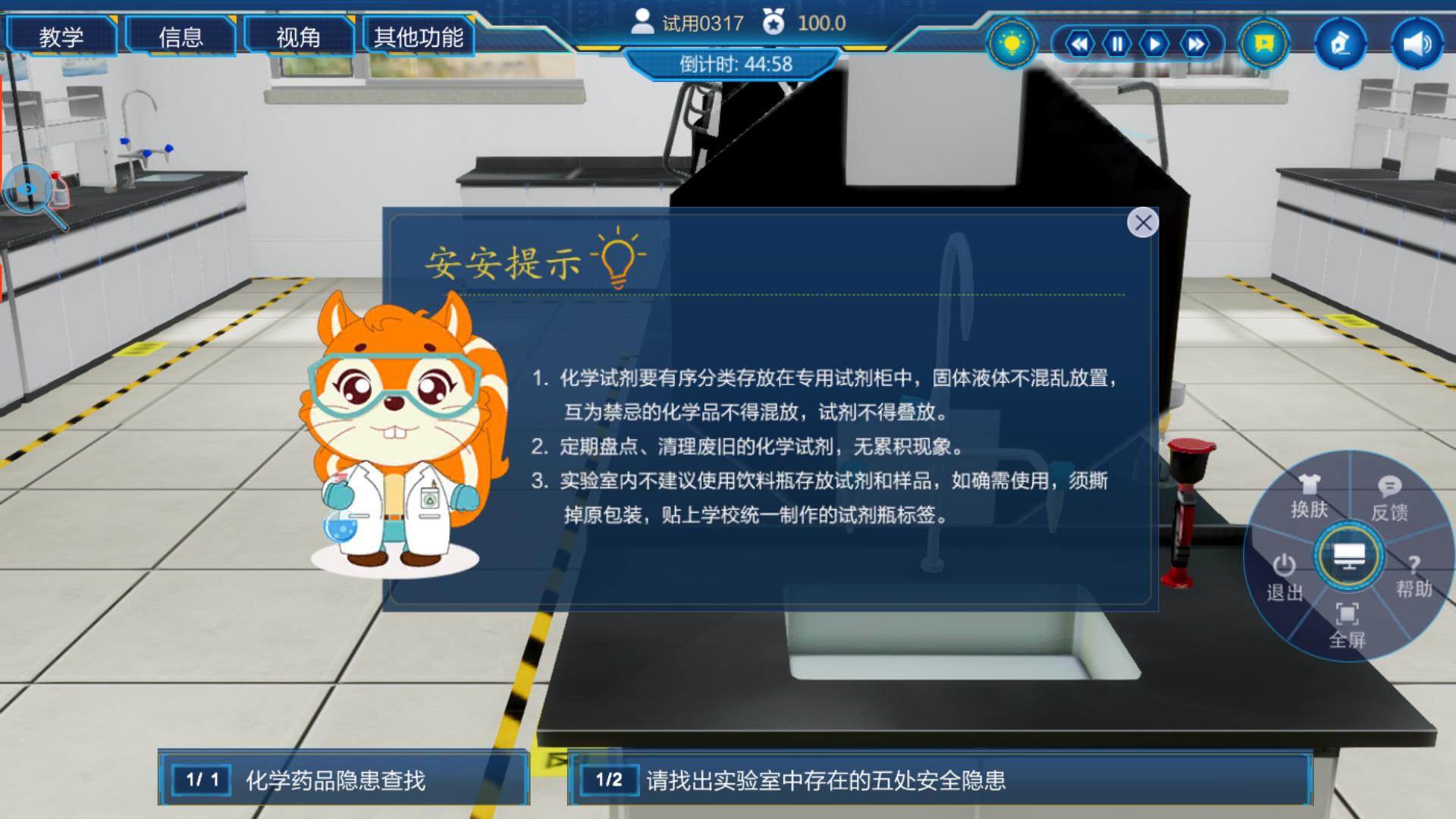 实验室安全虚拟仿真教学系统是依据教育部最新版《高等学校实验室安全检查项目表》的检查要点,运用高度仿真3D技术虚拟学校实验室场景开发。系统采用任务驱动虚拟仿真实验教学模式,即以任务为中心,将学生的学习和实践紧密相连,力求将理论知识转化为实际操作经验,为学生提供逼真的情境和任务,让学生在“练”中“学”,“学”中“练”,锻炼实操能力。我校举办的第二届实验室安全技能竞赛应用本系统开展实验室安全隐患查找比赛;材料学院、林学院将本系统应用在实验室安全教育必修课程的实操考核;国际交流学院利用本系统对留学生进行实验室安全技能培训。